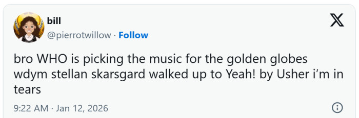 "Bro WHO is picking the music for the Golden Globes wdym Stellan Skarsgard walked up to Yeah! by Usher I’m in tears,"