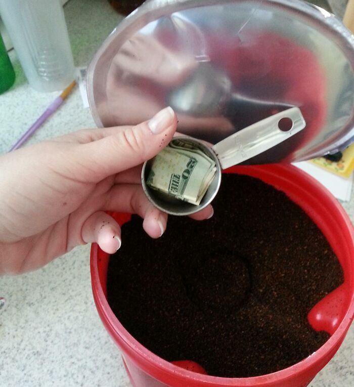 "Every Time My Dad Visits He Hides A $20 Bill Before He Leaves. This Spot Is By Far The Best. I've Been Making Coffee Like This For A Week Before I Noticed"