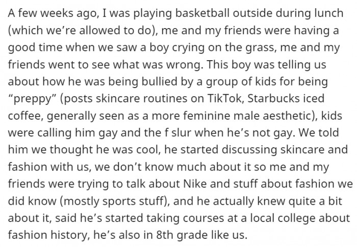 OP and his friends were definitely great kids. They not only stopped the bullying of that one guy, but they also gave him a safe space to be himself and express himself.