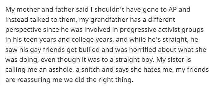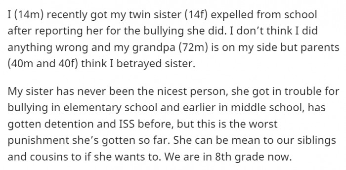 Redditor circagym262 explained that he got his sister expelled from school for completely valid reasons, and while their grandpa is on his side, his parents aren't and think he betrayed his sister.