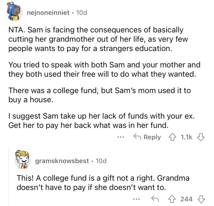 Starting relationships can be the easiest thing in the world; however, maintaining them can be rather challenging for most people. As Dr. William Doherty, family therapist, states, "Relationships require ongoing effort and attention; neglect can lead to irreversible damage." People notice when you put any amount of effort into maintaining the relationship and build an image of you in their heads. It's easy to ruin that image with neglect and a lack of care, and once you burn that bridge, there's no going back. Neglect can end up ruining a relationship entirely. Once it's ruined, it can be final and hard to fix. A Redditor made a post on the r/AmItheAhole subreddit, explaining how his mother decided to no longer fund his daughter's college education after she constantly neglected his side of the family. The daughter claims her grandma's decision is unfair and expects OP to help her with the college funds. The Reddit community had a lot of different reactions to the user's post. Scroll down to check out the full Reddit post, and scroll a little further to read the comments from the original post.