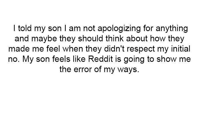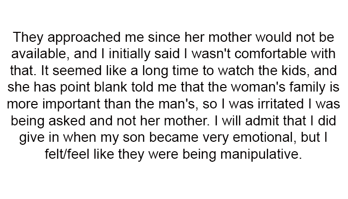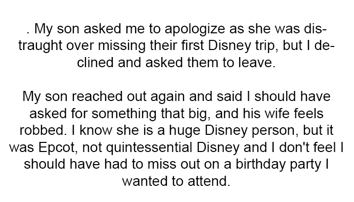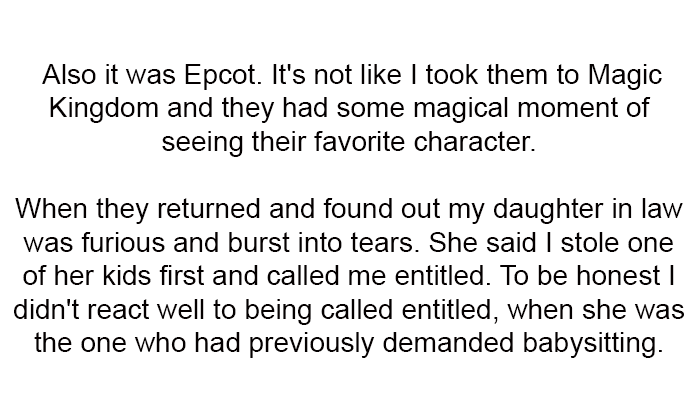The son asked his mother to apologize, but she refused, feeling that her initial hesitation and subsequent manipulation were being overlooked. She stands by her decision, believing that she had every right to take the children to Epcot during her extended babysitting stint.