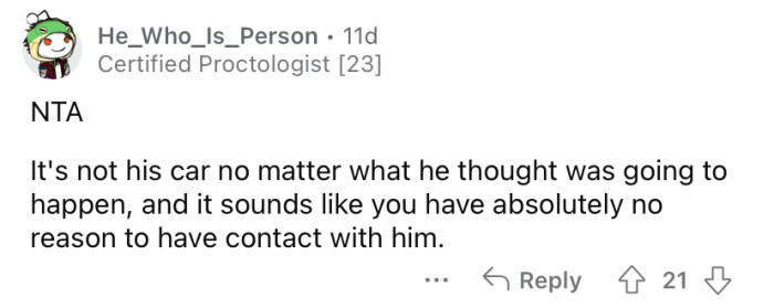 But, when OP's father found out, he was angry because he assumed the car would be given to him.