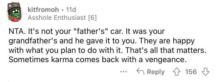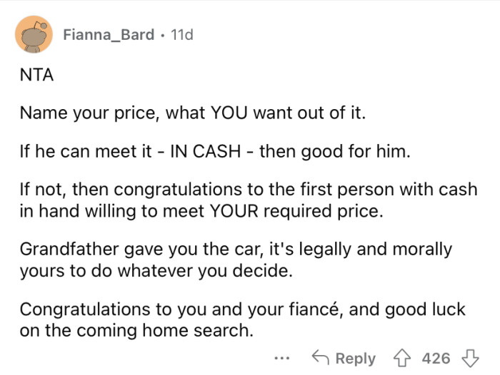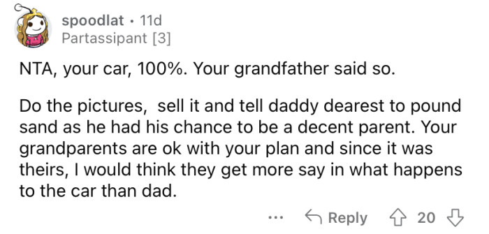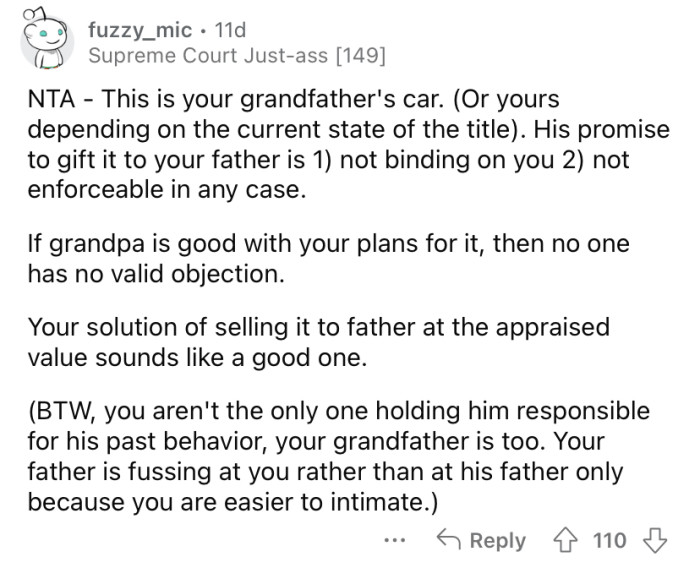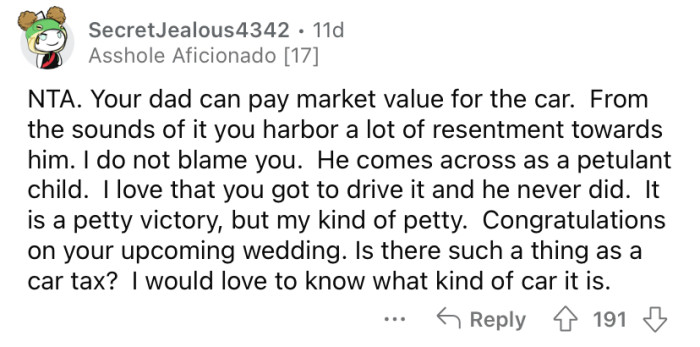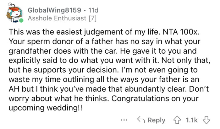 The Redditor's dad assumed that the car would be given to him. So, the OP told her dad that if he had the car appraised, she would sell it to him. The OP's grandparents are happy with the idea of the car being sold after the wedding. They are content knowing that the money will go towards helping them buy a house. But now OP is wondering if she's wrong for keeping the car from her dad. Keep scrolling to see how people reacted.