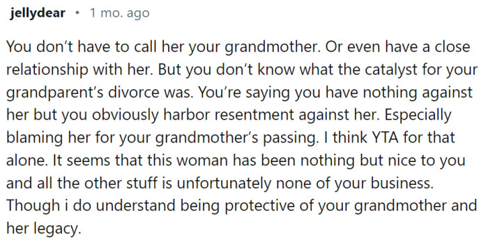 In this case, the Redditor might benefit from exploring ways to accept the new woman in their grandparents' lives while honoring their own feelings.