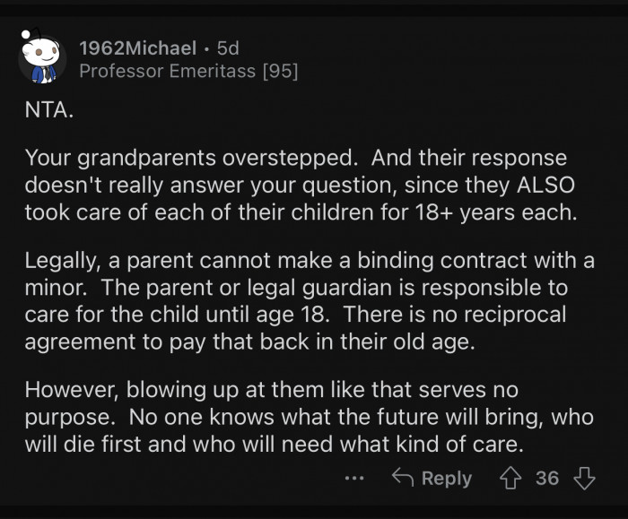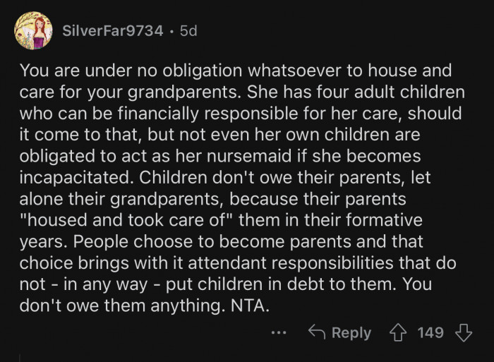 Some people dislike the idea of being burdened by taking care of their parents after they are no longer capable of doing so themselves. At some point, someone has to take up that responsibility; otherwise, the only other available option is a nursing home. According to Dr. William Doherty, family therapist, "The decision to care for aging parents can be fraught with emotional conflict, but it often leads to deeper family connections." Many people do not have an issue with taking care of their parents and dislike even the suggestion of sending them to a nursing home. They want to spend their twilight years with them and make them part of their family. In some cases, even when the children are more than happy to fill that role, the financial aspect can prevent them from considering it as an option. However, those who are not financially struggling are more than happy to repay their parents for all the love and care they provided during their childhood. A Redditor who goes by the username u/throwgma made a post on the r/AmItheA**hole subreddit, where she explained how she was shocked after discovering what role her grandparents expected her to fill. The user received a lot of interesting reactions to her post. Scroll down to check out the full Reddit post, and scroll a little further to read the comments from the original post.