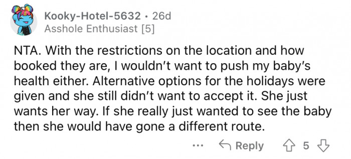 He even offered to help cover hotel costs since they live in a small apartment. But OP's MIL came up with several excuses as to why that wasn't an option.