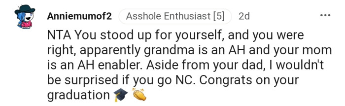 "NTA. You stood up for yourself, and you were right; apparently, grandma is an AH and your mom is an AH enabler."