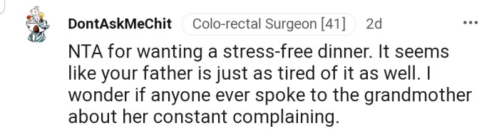 This Redditor has decided to take a stand against their grandma's tableside drama!