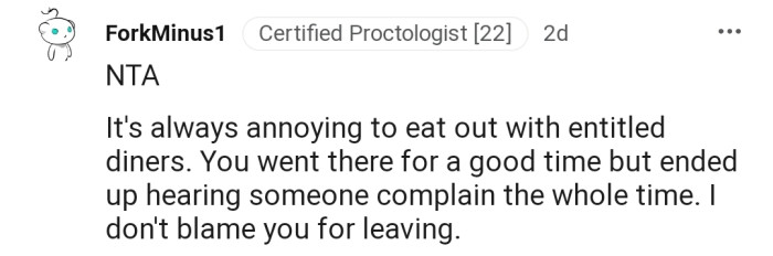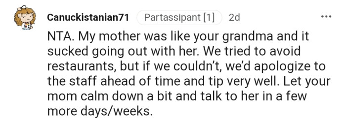 During the dinner, OP’s grandmother complained repeatedly about her food and made unrealistic requests that put the waiter in a difficult position. The back-and-forth frustrated OP, forcing them to leave the dinner abruptly.