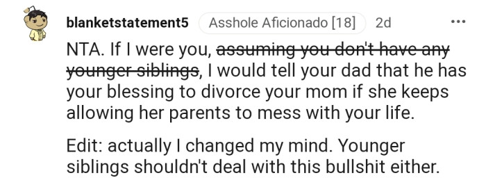 "I would tell your dad that he has your blessing to divorce your mom if she keeps allowing her parents to mess with your life."