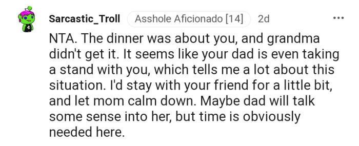 Reddit.comNot Long into the Dinner, OP's Grandmother Started Complaining About Her Food and Putting the Waiter in a Difficult Situation. This Forced OP to Leave the Restaurant in Disappointment, with Plans to Attend Their Friend's Graduation Party Instead