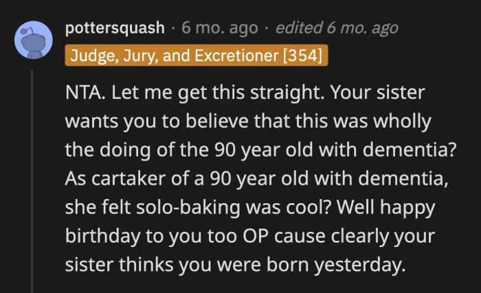 People Doubted If OP's Grandma Actually Baked the Cake Without OP's Sister Assisting Her.