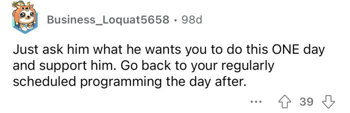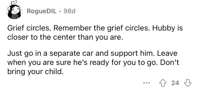 So, the OP asked her husband why he couldn't just go in a separate car with her, and he immediately started crying, saying he shouldn't have to deal with this after his grandmother just died. The OP told him it's his choice what he does, but she's annoyed that he isn't concerned about her feelings.