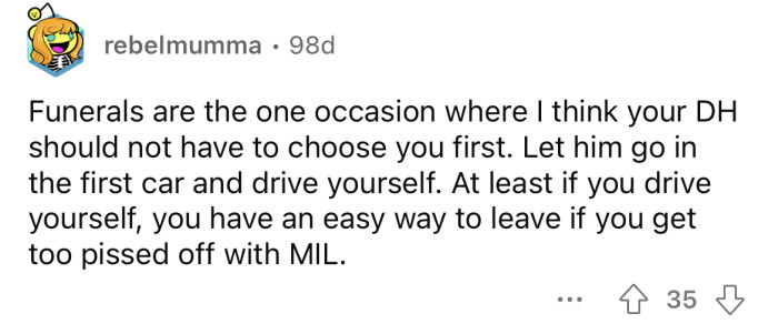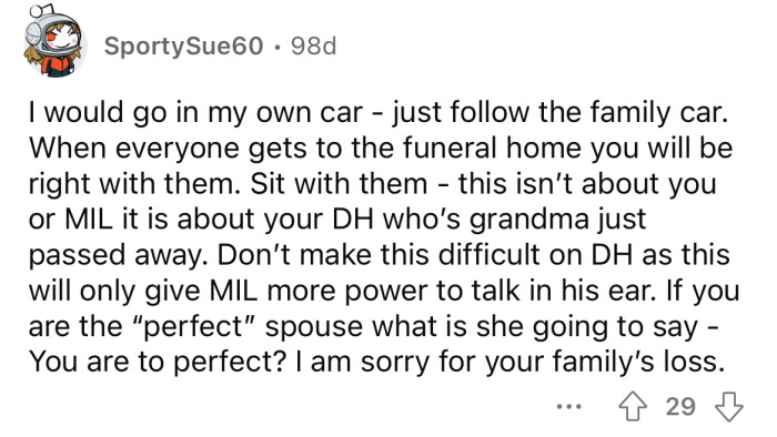Reddit/Aggravating_Salt4492For the grandmother's funeral, OP's MIL made arrangements for a funeral car to transport some of the immediate family to the service.