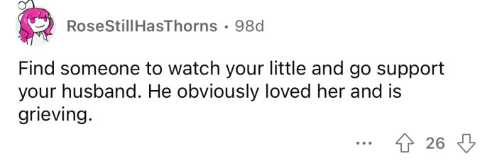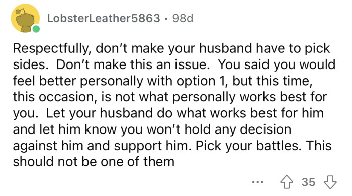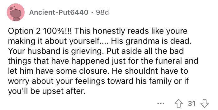 The Redditor says her preference would be option one because she would still like the opportunity to attend the funeral and pay her respects. However, she's also upset because she feels that her husband is prioritizing his family over her.