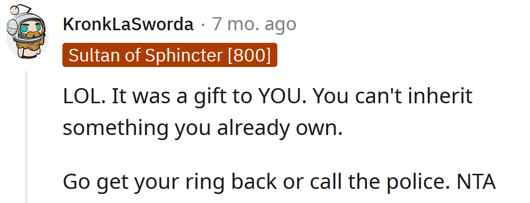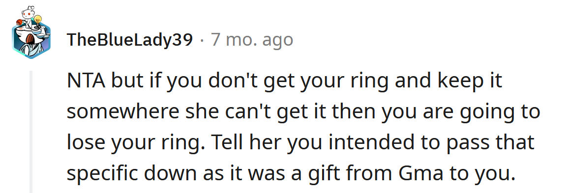 Reddit/Adorable-Trust362She explained that her grandmother passed away when the OP was 11, and before she died, she gave the Redditor an expensive gold ring.
