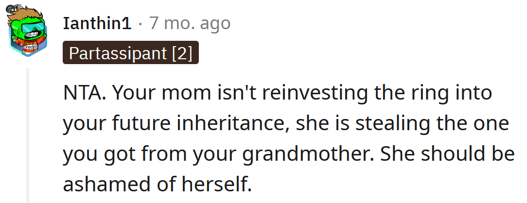 The OP was shocked that her mother would suggest something so selfish. However, her mom justified it by saying the OP would inherit all of her rings when she dies.