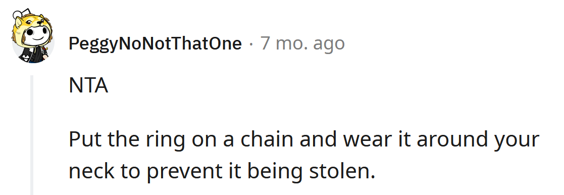 She explained that her grandmother passed away when the OP was 11, and before she died, she gave the Redditor an expensive gold ring. The ring no longer fits, so the OP doesn't wear it, but she has kept it for its sentimental value.