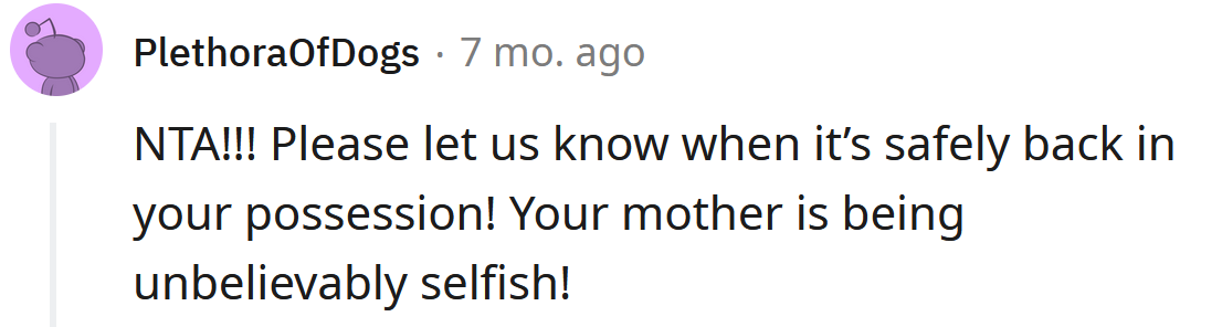The OP was shocked that her mother would suggest something so selfish.