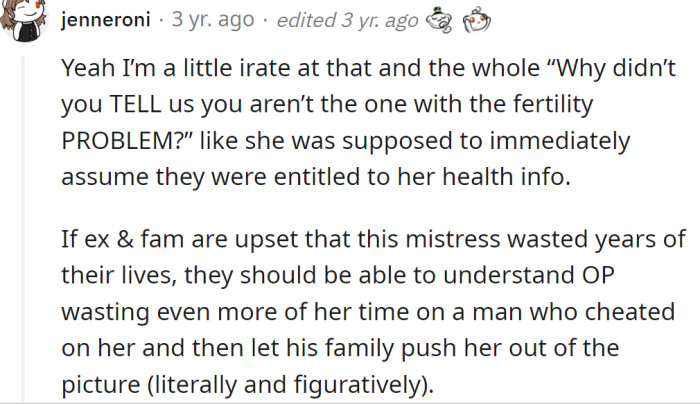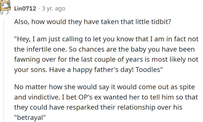 But she chose not to share her suspicions, feeling it was not her place to do so. On the other hand, her ex-husband discovered the OP's pregnancy and his potential infertility through a Facebook post.