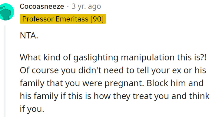 Now her ex blames her for not telling him about her pregnancy earlier, and she's not sure if she was in the wrong for minding her own business: