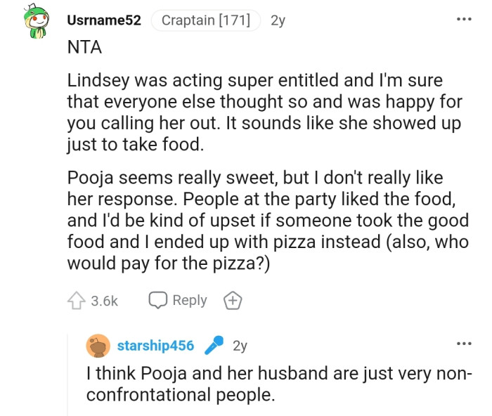 The Reddit community is solidly behind OP on this matter. The commenters have called out Lindsey for her poor manners while applauding OP for how they handled the situation.