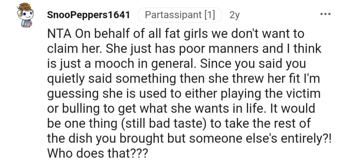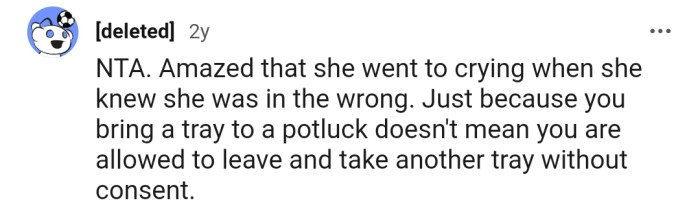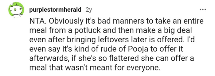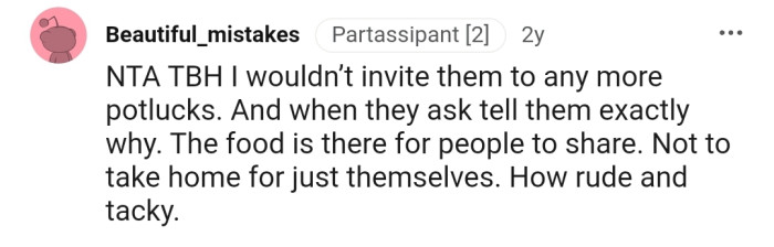 "NTA. Obviously, it's bad manners to take an entire meal from a potluck."