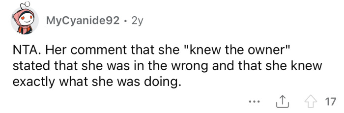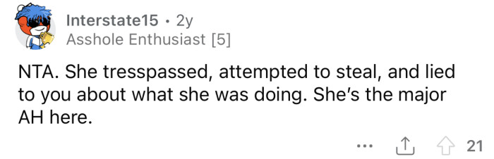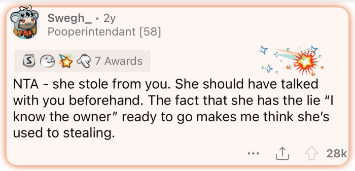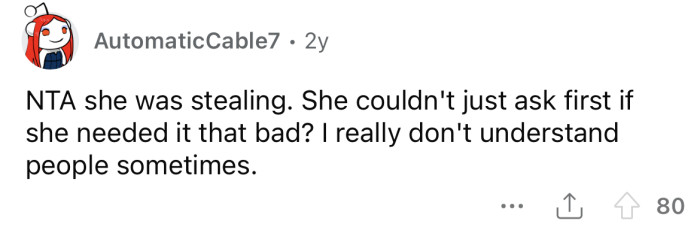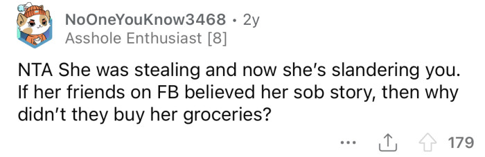The Redditor told her that since he was the owner and he didn't know who she was, perhaps she should think again. When the woman realized she'd been caught red-handed, she tried to make a run for it with a large bag of food in hand. The OP told her to drop the bag, or he would press charges, to which the woman began crying and said she needed the food for her child.