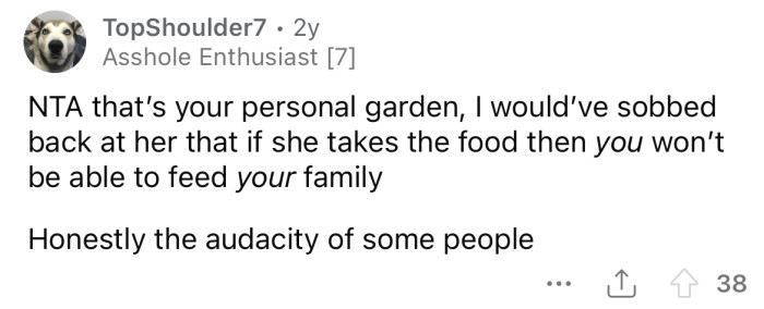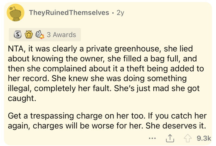 To the OP's surprise, he found one of his neighbors helping herself to some of the vegetables from the greenhouse. The OP shouted at the woman, and she replied by saying it was fine as she's "friends with the owner."