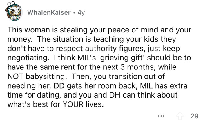 MIL lives in the OP's house and pays below-market rent in exchange for helping them with babysitting.