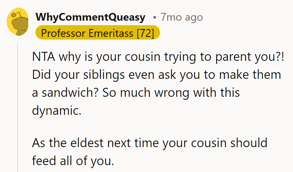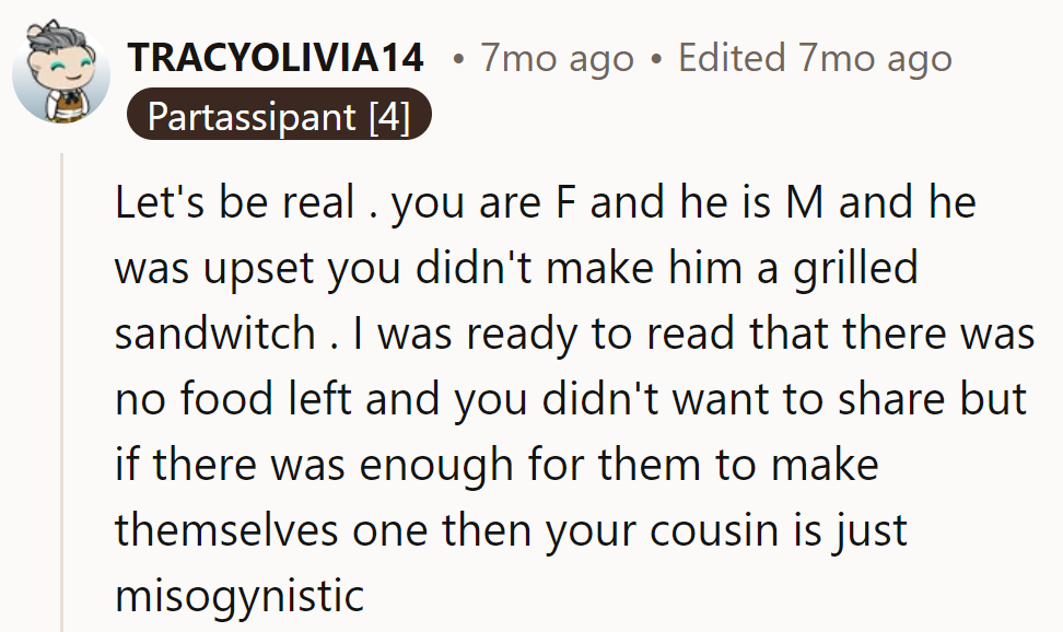 She makes herself a grilled cheese sandwich, hoping to enjoy a quiet lunch in the living room. But then her cousin, who’s a decade older and still trying to "get on his feet," accuses her of being selfish for not making sandwiches for her siblings too.