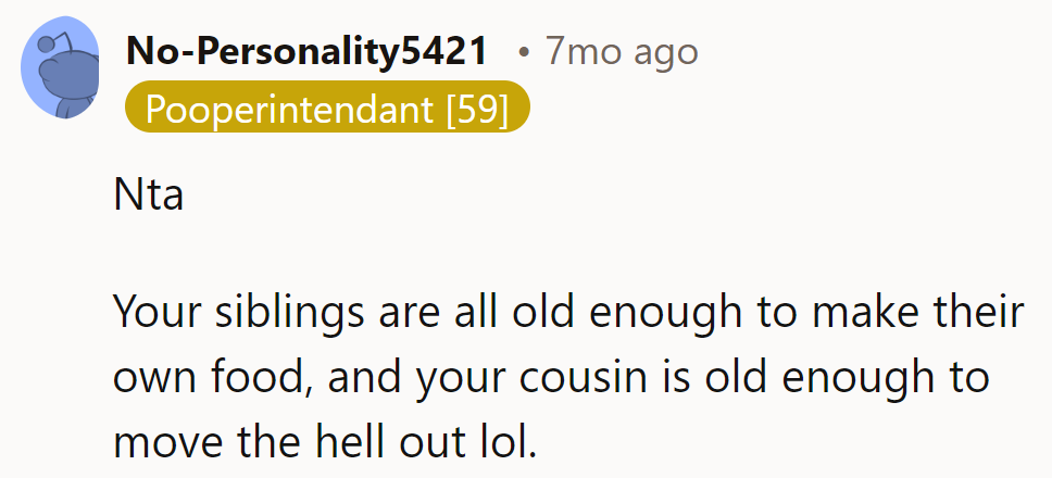 OP lives with her mother, three siblings, and a 28-year-old cousin who is staying temporarily.