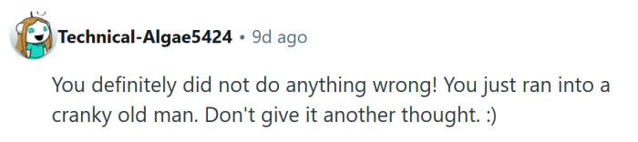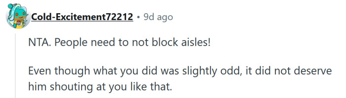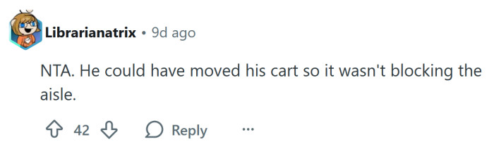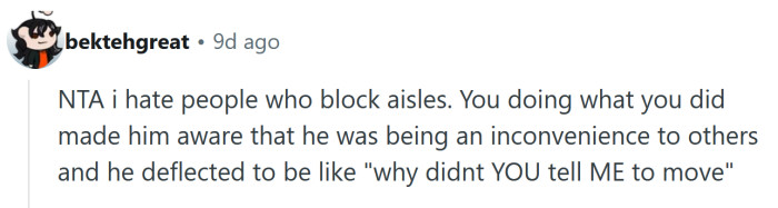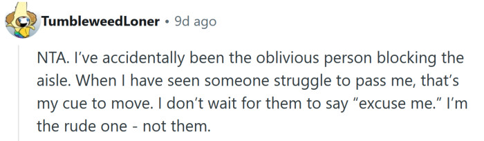 To her, it seemed like common sense — if someone cared about making room for others, they wouldn’t block the aisle in the first place. She figured he wasn’t bothered enough to move his cart unless someone directly asked, and she didn’t see the need to engage when she could handle it herself.