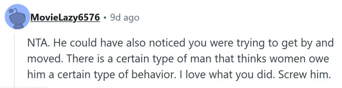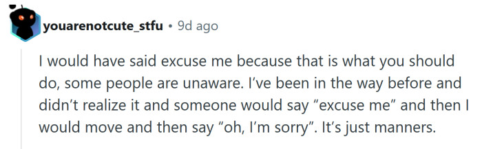 As comments poured in, people were divided. Some thought she could have just said “excuse me” to avoid conflict. Others felt the man was being unnecessarily aggressive and that it wasn’t her responsibility to compensate for his lack of spatial awareness.