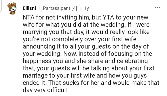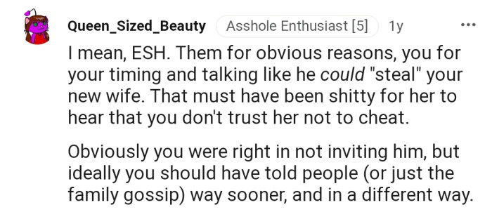 "I mean, ESH. Them for obvious reasons, you for your timing and talking like he could 'steal' your new wife."