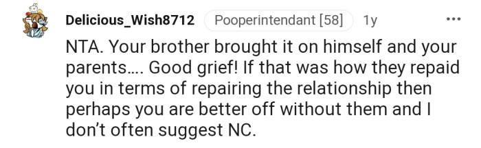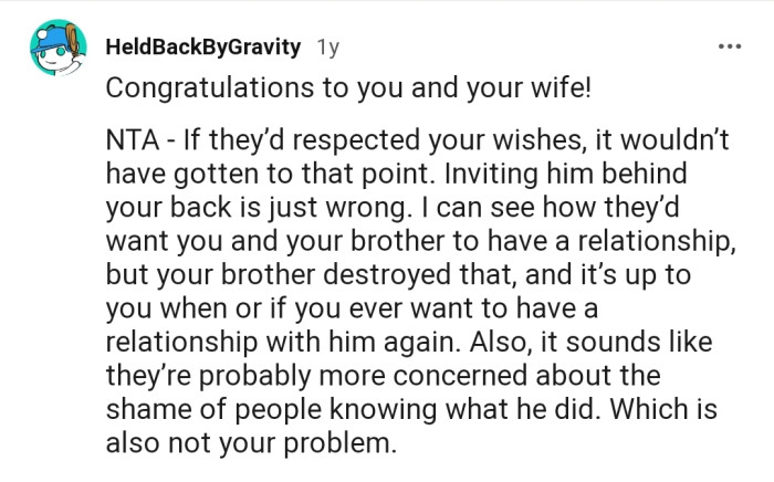 In addition, a majority of Redditors condemned the manipulative tactics employed by his parents and sympathized with his reluctance to invite his brother.