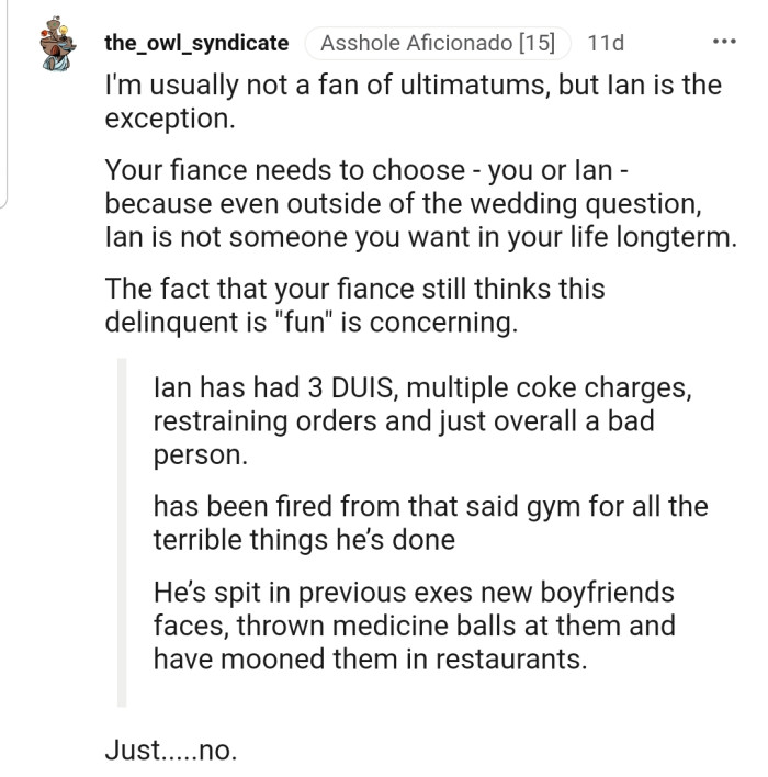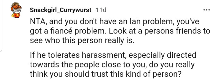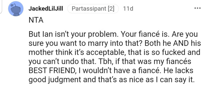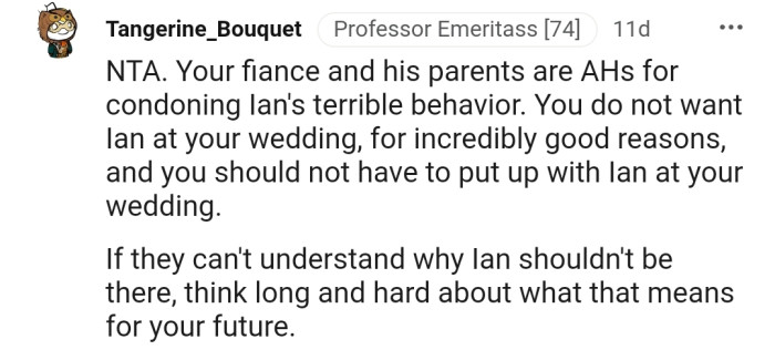 Despite Ian's vile nature, OP's fiancé has found it difficult to cut him off due to their long-standing friendship. In addition, OP's mother-in-law has backed her son to keep his "best friend" close.