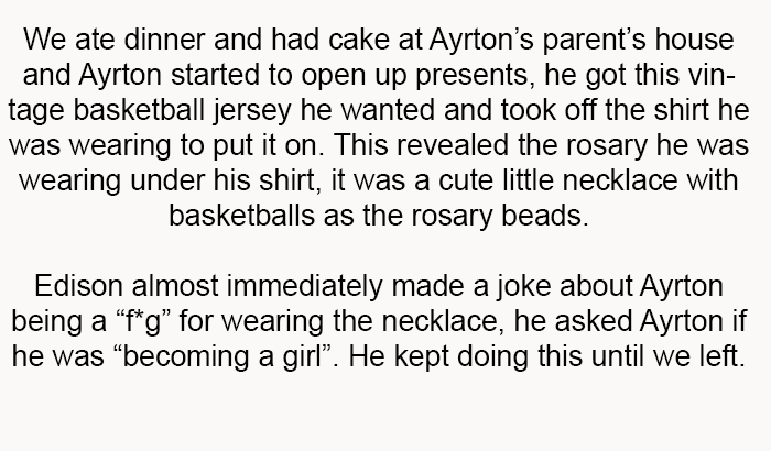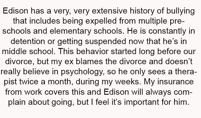 A father (31M) grapples with his son Edison's (12M) troubling behavior at a family birthday party, where Edison mocked his cousin Ayrton (11M) for his religious beliefs and attire. Despite the father's efforts to instill respect and address Edison's history of behavioral issues through therapy, the incident escalates into a conflict with his ex-wife over parenting decisions and Edison's relationships within the family.