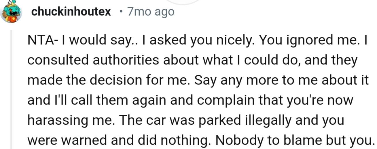 When the officer arrived, they went straight for the overkill and towed the offending vehicle. Now, OP’s furious neighbor was demanding reimbursement.