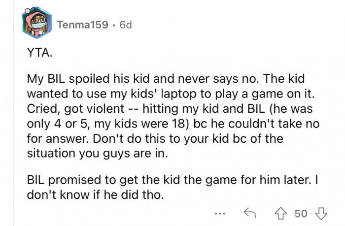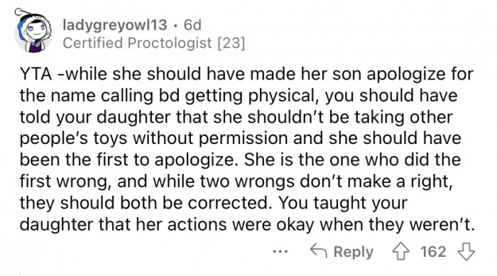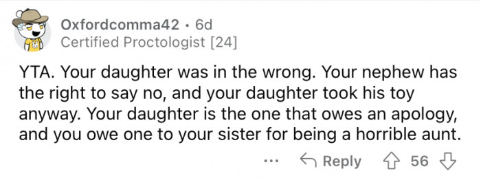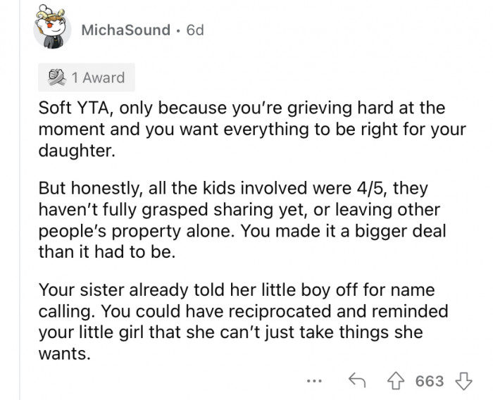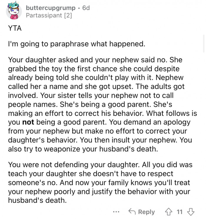 As it turned out, the OP's daughter had taken a toy from her cousin without his permission, so he snatched it back from her. The Redditor says she assumed her sister would force her little boy to apologize, but that didn't happen.