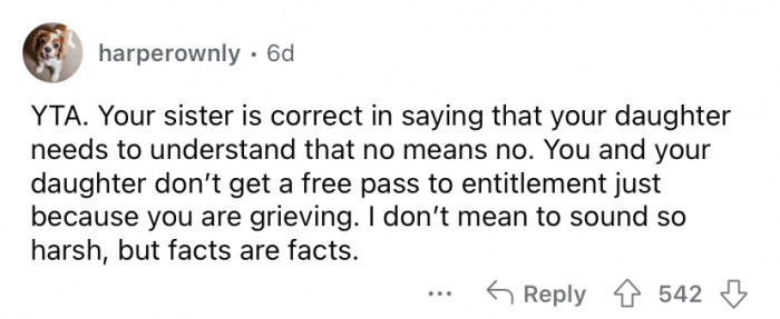 "You and your daughter don't get a free pass to entitlement just because you are grieving."