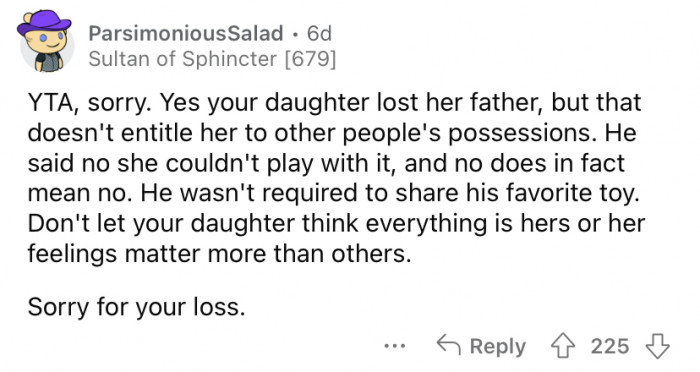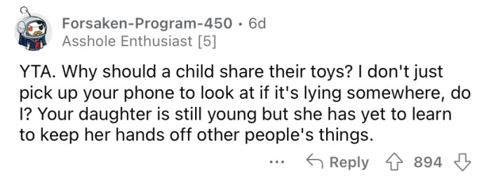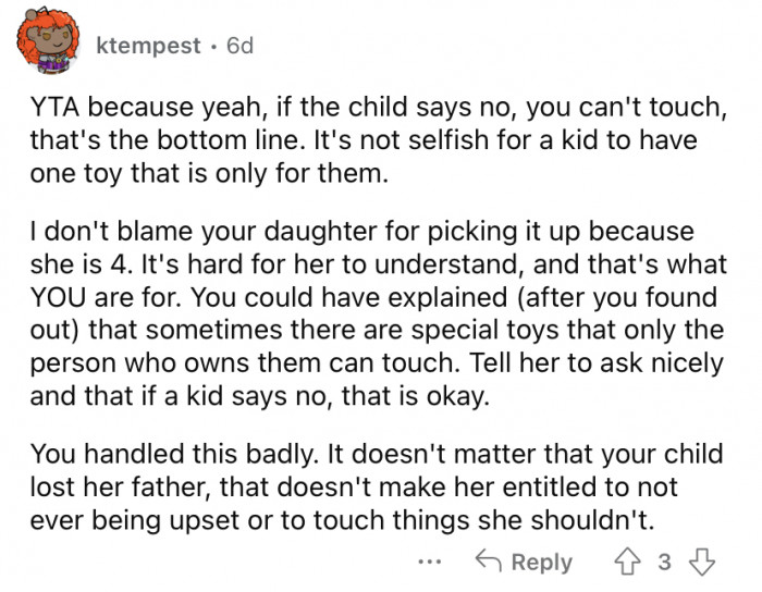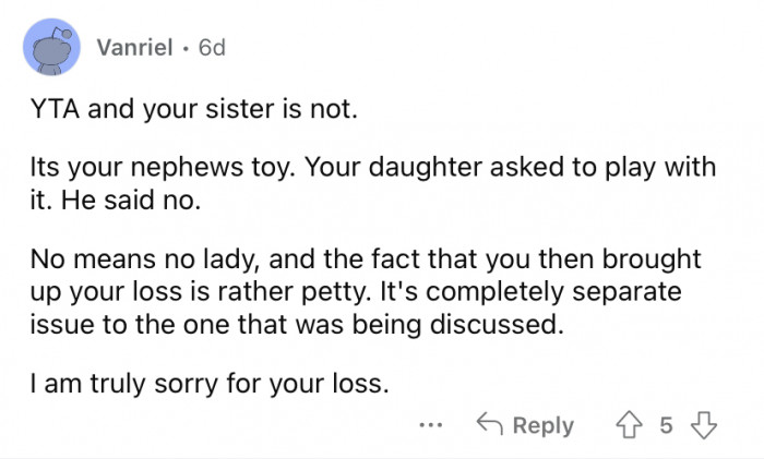 "That toy is his, and it’s something that he treasures, especially since he’s experiencing very bad nightmares, and it’s the only thing that brings him comfort," OP's sister said. "I’d appreciate it if you'd tell your daughter that no means no."