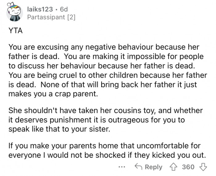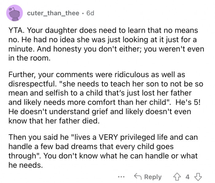 The OP took it even further, telling her sister that she needs to teach her son not to be so "mean and selfish" toward her daughter, who is grieving her father. She says her nephew lives a "very privileged life" and should be able to handle a few nightmares.