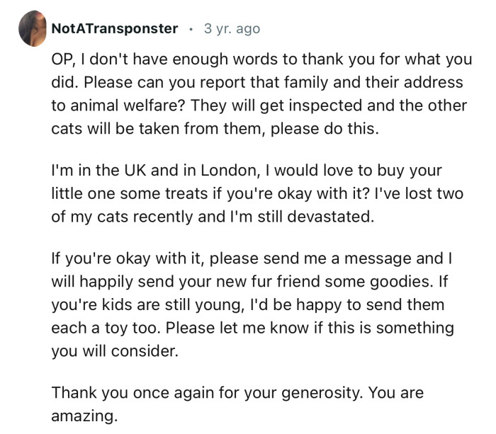 Worst of all, the cat owner made it clear that they had already scheduled a euthanasia appointment for the cat and would follow through if OP failed to agree to their terms.