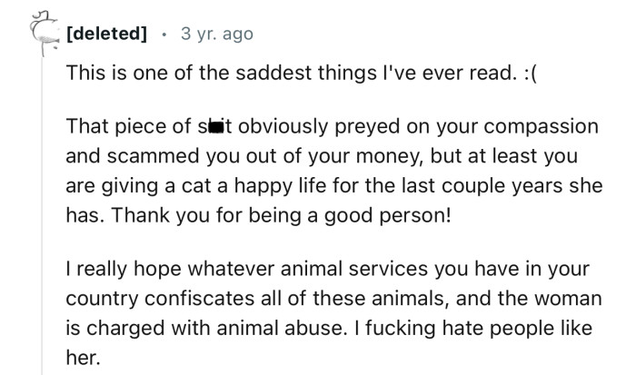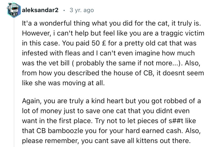 "Again, you are truly a kind heart, but you got robbed of a lot of money just to save one cat."