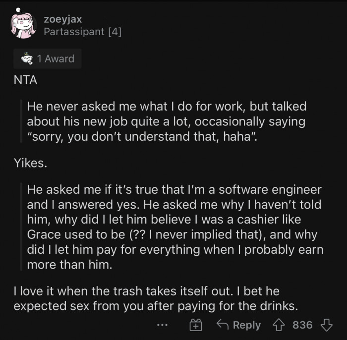 This situation highlights how deeply societal norms can affect individual behavior, especially in dating. The guy's need to boast about his salary suggests he's seeking validation to counteract feelings of inadequacy—common when facing a successful partner. When he discovers his date is a software engineer, it likely triggers his insecurities, revealing how rigid gender roles and financial status can impact personal connections.