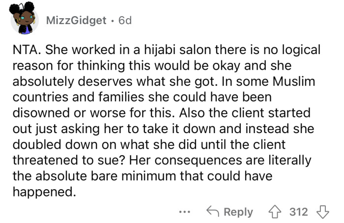 Reddit user u/Sad_Being_3868 recently shared a story in the AITA (Am I The A**hole?) subreddit about her friend, "Polly," who messed up and lost her job as a result. The OP explained that Polly worked at an all-female hair salon that caters to Jewish and Hijabi Muslim women.