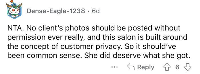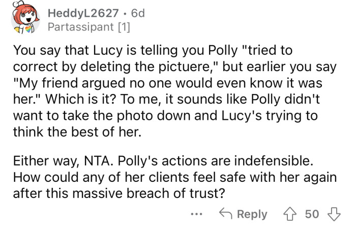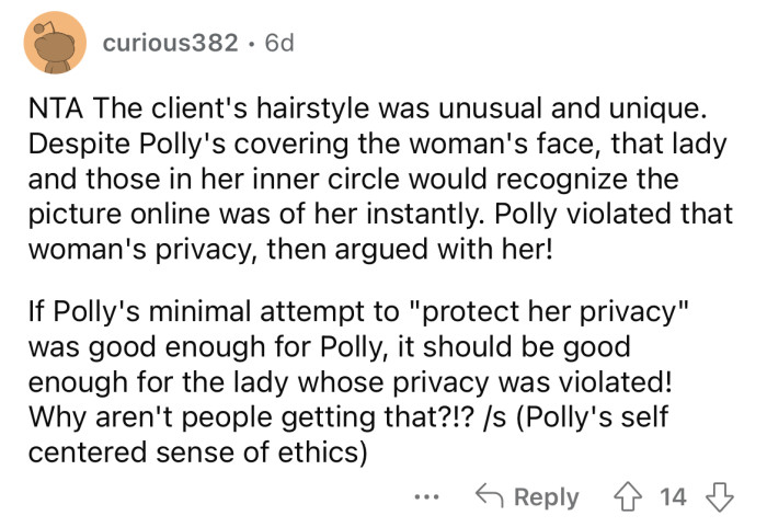 However, Polly posted the photos online. When the client saw it, she was distraught because men would be able to see her hair.