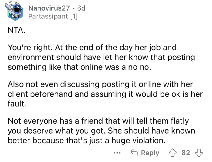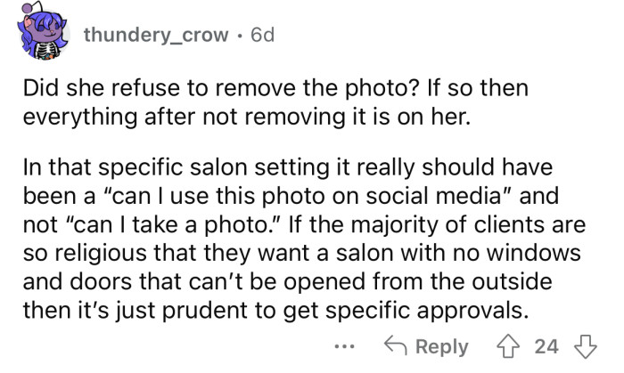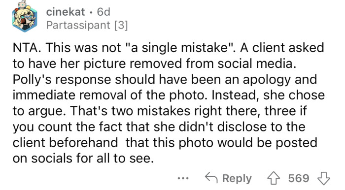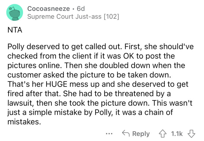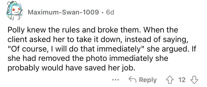 Polly argued that no one would know who the woman was, but that wasn't the point, and the woman threatened to sue if she didn't take the picture down. She also complained to the manager, and Polly was fired as a result.
